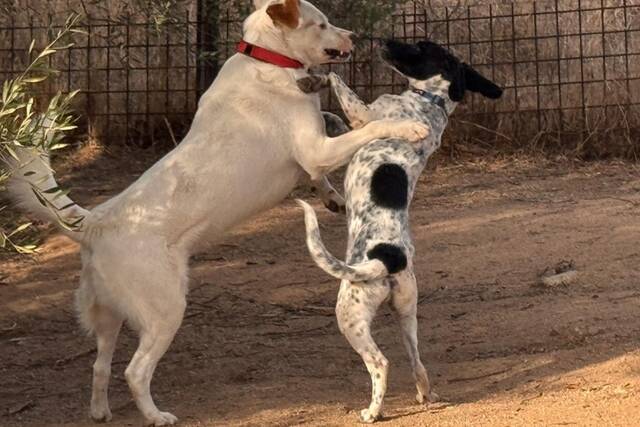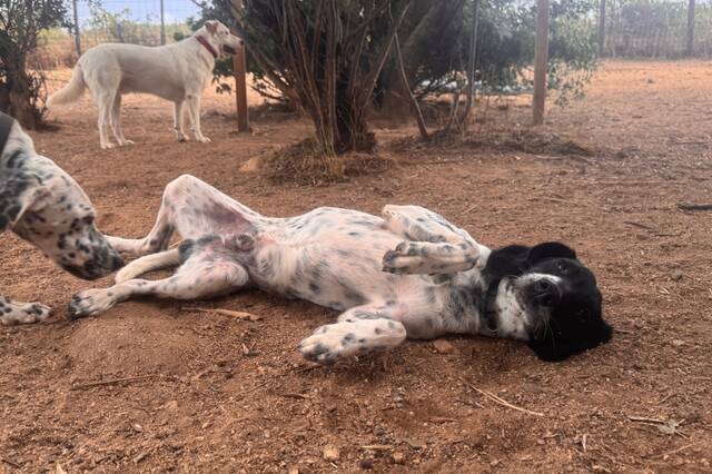 Frankie hat nach seiner schweren Zeit einen begehrten Platz auf dem Weinberg ergattert. Hier lebt er nun in der Hundegruppe und hat sich – typisch Segugio – in erstaunlich kurzer Zeit eingefügt. Die Gemeinschaft tut ihm gut, er lernt die Hunderegeln, verbessert seine hündische Kommunikation und profitiert sichtbar von der Gesellschaft seiner Artgenossen.