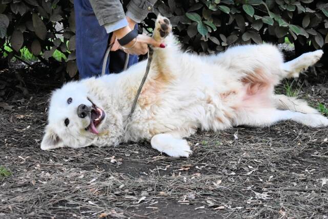 Und damit wären wir wieder an der Stelle angelangt, an der ich Ihnen gerne erklären möchte, warum Hadriano für mich so viel mehr ist als nur einer unter vielen: Dieser wunderschöne, zugegebenermaßen aktuell mangels Pflege etwas zerzauselte, Prachtkerl hält das alles nicht nur seit mehr als 4 ½ Jahren (Stand Mai 2025) aus, sondern konnte sich dabei sogar sein liebenswertes Wesen bewahren. Die schlechten Jahre haben ihn (bisher) nicht kleingekriegt! Der süße Schlumpf ist zwar anfangs etwas schüchtern, aber sobald er die Gelegenheit bekommt, den Zweibeiner an seiner Seite als „vertrauenswürdig“ einzustufen, ist er ein durchweg anhänglicher, freundlicher und liebevoller Hund, der obendrein auf dem Rücken liegend sein „Grinsekatzen-Gesicht“ präsentiert!