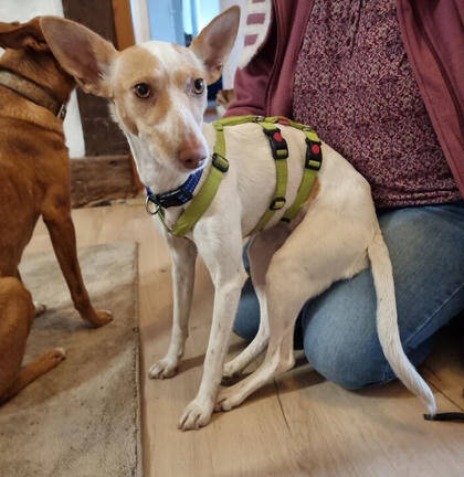 Menschen gegenüber ist Hada3 freundlich und sucht den Kontakt. Gerne nimmt sie Streicheleinheiten an, ist verschmust und sogar hochheben lässt sie sich. Mit ihren Artgenossen hat sie sich im Shelter und auf ihrer Pflegestelle als verträglich gezeigt. Sie tobt und spielt auch gerne mal eine Runde. Sicher hätte sicher nichts gegen einen Hundekumpel in ihrem Zuhause einzuwenden. Eine Katze könnte ebenfalls teils ihres neuen Rudels sein, allerdings sollte diese hundeerfahren sein. Hada3 sucht zwar nicht nach Streitigkeiten mit Katzen, aber bellt diese trotzdem ab und zu an. Leine und Geschirr konnte Hada3 bereits kennenlernen und das läuft auch schon ganz ordentlich, solange keine Ablenkung da ist. Mauselöcher findet sie sehr spannend, ein gewisser Jagdtrieb ist also definitiv vorhanden. Treppensteigen hat sie bereits gemeistert. Auto fahren konnte Hada3 auch schon kennenlernen, allerdings sollte dies in kleinen Schritten mit ihr geübt werden, da es sie noch sehr stresst. Das Hundeeinmaleins muss der Podenca erst noch bei gebracht werden. Sie ist aber hochmotiviert zu lernen, also sollte das mit der richtigen Unterstützung gut gelingen. "Sitz" konnte die Hündin auf ihrer Pflegestelle schon lernen und warten bis sie an der Reihe ist zum anleinen, tut sie auch schon brav.