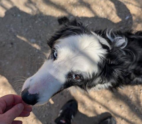 Siena1 ist eine fröhliche und intelligente Hündin. Trotz ihrer Rasse hat sie einen eher ruhigen und ausgeglichenen Charakter, die Bedürfnisse eines Border Collies dürfen dennoch nicht außer Acht gelassen werden. Menschen gegenüber ist Siena1 anhänglich. Ihren Betreuern folgt sie, um gestreichelt zu werden. Wenn der Hündin die Leine gezeigt wird, bleibt sie stehen und hält ihren Kopf daneben, damit sie ihr angelegt werden kann und sie mit auf einen Spaziergang genommen wird. Die Hunderegeln werden ihr noch fremd sein, aber es sollte kein Problem sein diese mit ihr zu erlernen. Mit anderen Hunden ist Siena1 gesellig, unabhängig vom Geschlecht. Im Umgang mit Artgenossen scheint sie eher unterwürfig zu sein. Gegen weitere Hunde in ihrem neuen Zuhause hätte sie also sicher nichts einzuwenden.