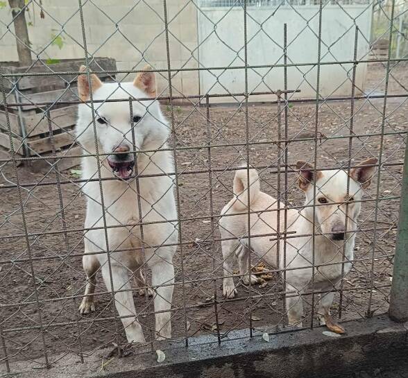 Dolce Vita, Mitsugetsu und Heron kamen im Zuge der Auflösung einer Zuchtkolonie Anfang Dezember 2024 in unsere Obhut. Heron war anfangs ein scheuer Hund und konnte auch noch nicht an der Leine gehen, da er große Angst davor hatte. Trotzdem war er von Anfang an freundlich zu allen, denen er begegnete. Er verstand sich nicht gleich mit allen anderen Hunden, spielte aber sehr gerne mit denen, mit denen er sich gut verstand